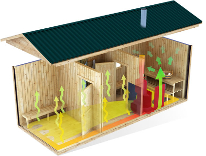Печь связана с системой теплого пола и циркуляцией воздуха. Баня нагревается со всех сторон — снизу, сбоку и сверху.