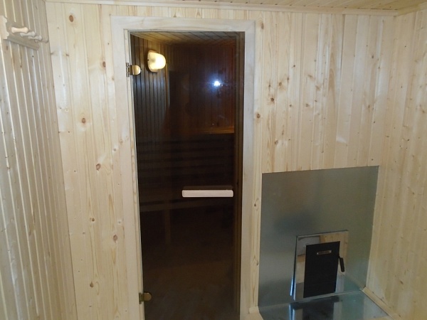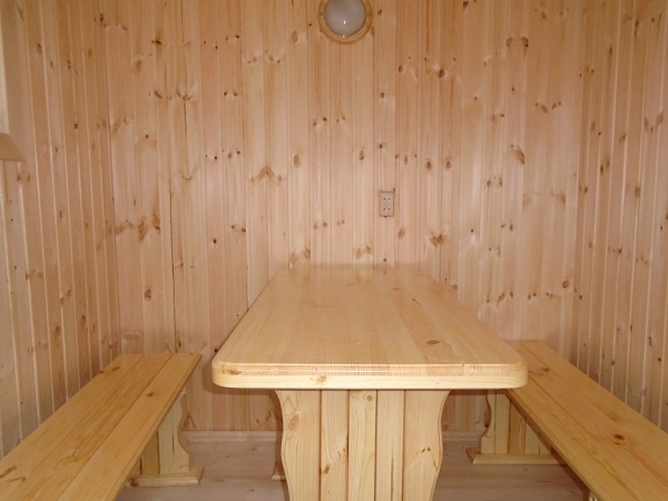 Двухъярусные осиновые полки, банная металлическая печь «Оса» со встроенным баком для горячей воды, дымоход от печки с искрогасителем и пожарной защитой, стол складной, 2 стула. |