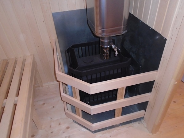 Печь связана с системой теплого пола и циркуляцией воздуха. Баня нагревается со всех сторон — снизу, сбоку и сверху.