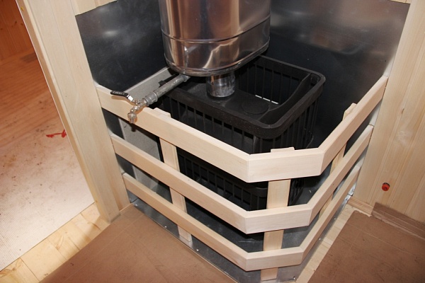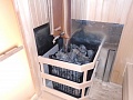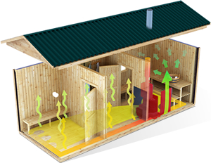 Печь связана с системой теплого пола и циркуляцией воздуха. Баня нагревается со всех сторон — снизу, сбоку и сверху.