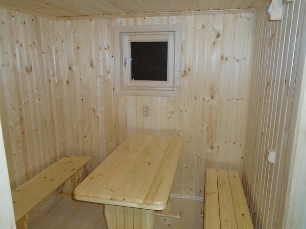 Предбанник: потолок, перегородки обшиваются хвойной евровагонкой класс «А». На стыки углов потолка и пола прибивается плинтус. Парное отделение: потолок, перегородки и стены обшиваются липовой вагонкой класс «А». На стыки углов потолка и пола прибивается плинтус. |