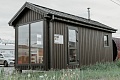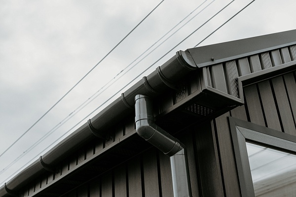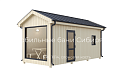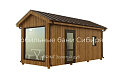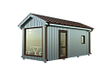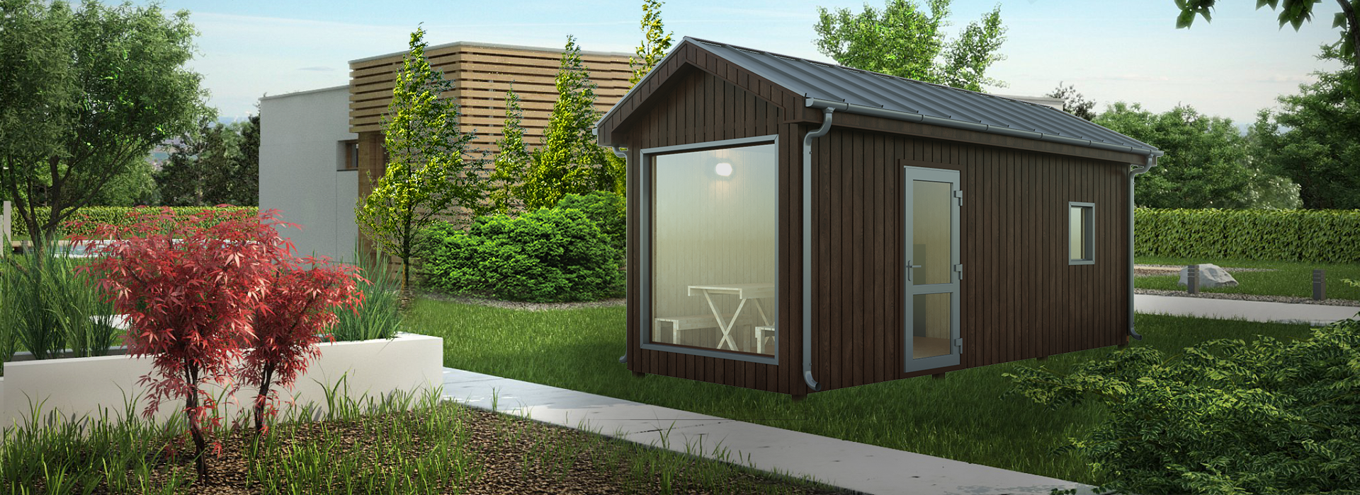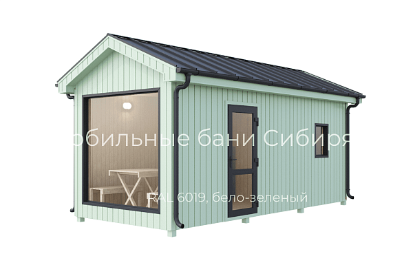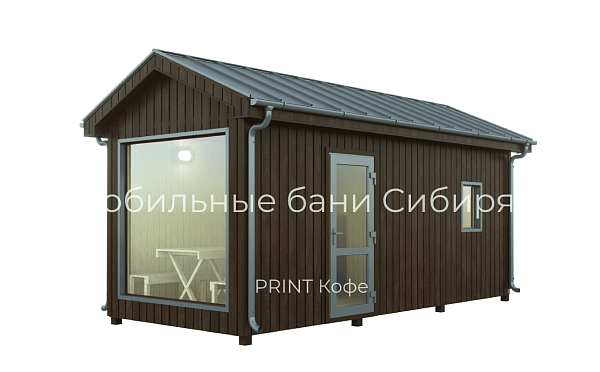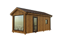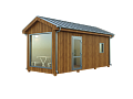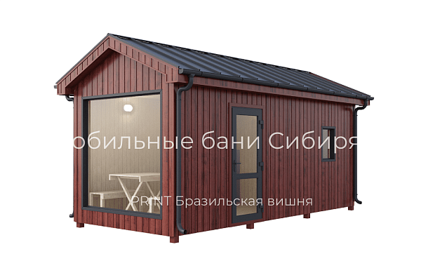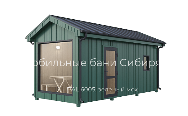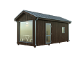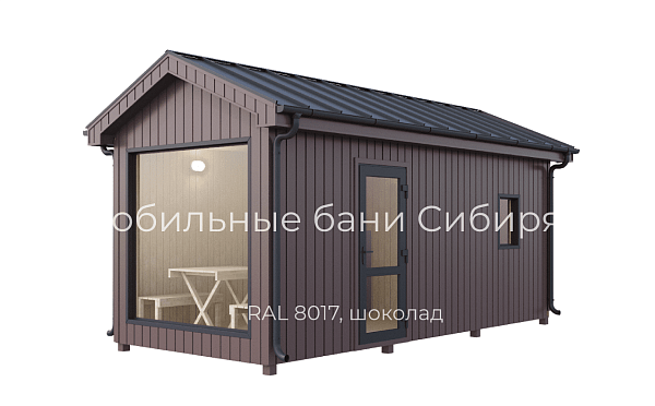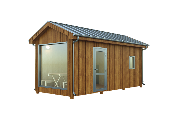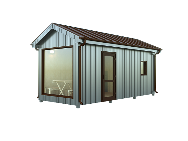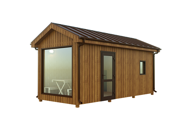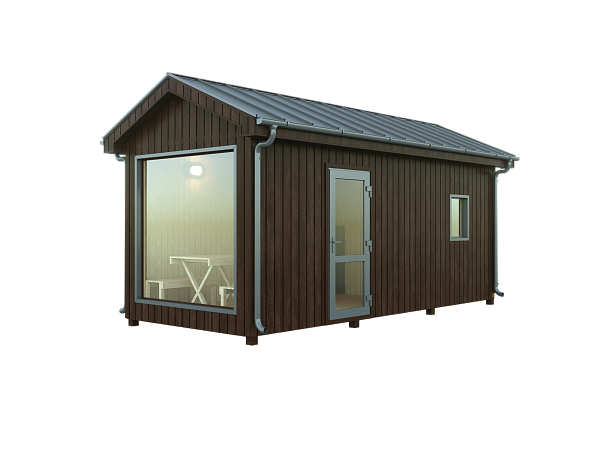 Модель премиального класса в скандинавском стиле. Фальцевая кровля, вертикальный металлический сайдинг с имитацией дерева, панорамное окно, двухкамерные пластиковые окна и двери. Длина 6 м