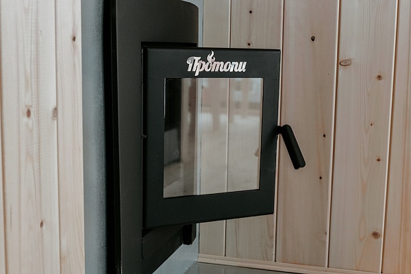 Двухъярусные липовые полки, банная печь «Протопи» со встроенным баком для горячей воды, дымоход от печки с искрогасителем и пожарной защитой, стол, два стула. |