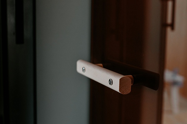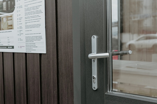 Входная с открыванием наружу, ПВХ, 2-х камерная, 3 стекла, открывание наружу, двойное остекление, нажимной гарнитур (ручка и замок с двух сторон), ламинация, алюминиевый порожек |
